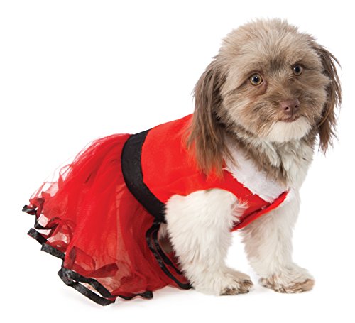 Feature : Santa's sweetie dog costume dress with attached belt / Tulle skirt trimmed in black / Small fits 14-inch chest and 11-inches neck to tail / Suggested breeds: Chihuahua, Pomeranian, Australian terrier, toy poodle / Rubies' offers holiday and novelty costumes and accessories in sizes and styles for the entire family