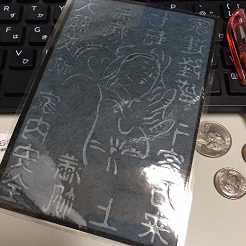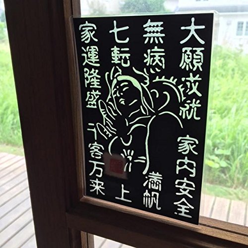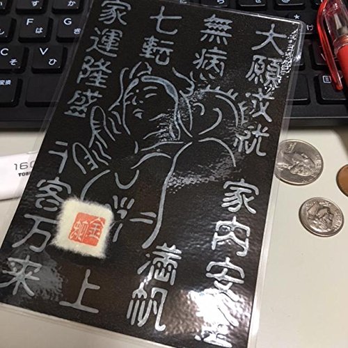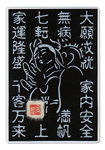 Cutout picture Japanese art collage KIRIE “Kanji characters that bring good fortune & White Snake Kannon” Made of Washi(Japanese paper) Mist Blue, 4” x 6”