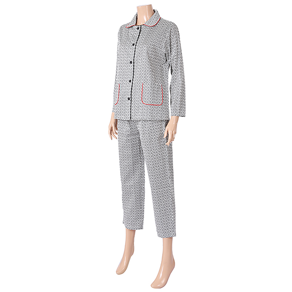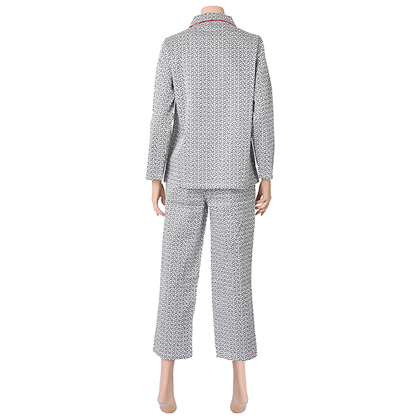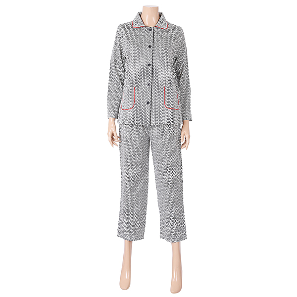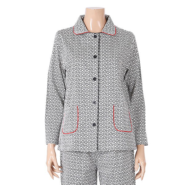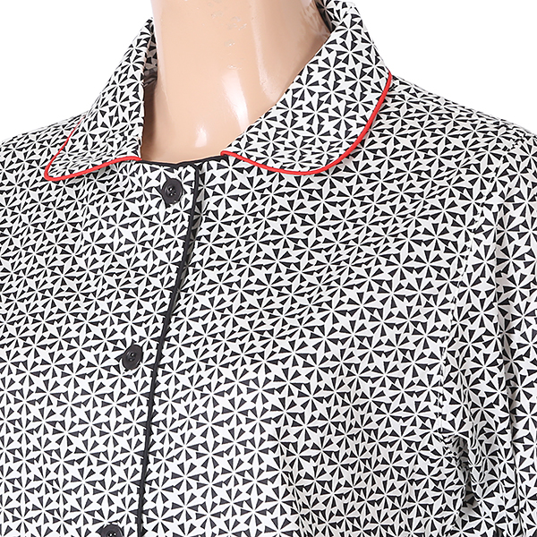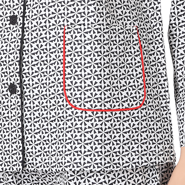 레드와 블랙 파이핑을 함께 매치하여 디자인 포인트를 주었고 원단은 블랙 화이트가 믹스된 바람개비 나염으로 모던함을 더했다.
