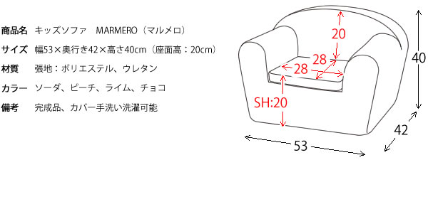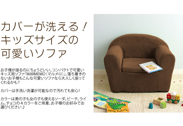 本商品はお取り寄せ商品のため、稀にご注文入れ違い等により欠品・遅延となる場合がございます。誠に恐れ入りますが、何卒ご了承ください。 また、以下の場合には追加送料がかかる場合がございます。  ・沖縄、離島および一部地域への配送時 ・同梱区分が異なる商品の複数購入時  【出荷目安】:1 - 5営業日 ※土日・祝除く 【同梱区分】:TS 2010 【梱包サイズ】:通常商品   【メーカー名】ミヤタケ(宮武製作所) 【型番】SF-10K  カバーは手洗い洗濯可能  お子様が座るのにちょうどいい、コンパクトで可愛いキッズ用ソファ『MARMEMO(マルメロ)』。 落ち着きのないお子様もこんな可愛いソファなら大人しく座ってくれるかも? カバーは手洗い洗濯が可能なので汚れても安心! カラーは男の子も女の子も使えるソーダ、ピーチ、ライム、チョコの4カラーをご用意。お子様のお好みでお選びください♪  【製品サイズ】W53×D42×H40×SH20cm  【製品重量】1.4kg  【主材質】 張地:ポリエステル、ウレタン  【原産国】中国  【完成品】  【仕様】 カバーは手洗い洗濯可能  【梱包サイズ】W53×D43×H42cm  【梱包重量】2kg  【注意事項】 ※画像のカラー・サイズとは異なる場合がございます。商品名のカラー・サイズをご確認下さい。