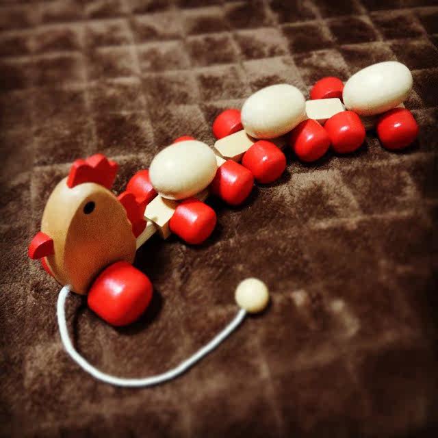 游戏方法:母鸡妈妈下了三只蛋(木质鸡蛋非常逼真),拖着鸡蛋宝宝寻找她们的新家。咕噜咕噜,滚呀滚呀,何时能孵出鸡宝宝呢?三只鸡蛋在小轮子的带动下大幅度地滚动起来,滑稽可爱!车子是可以拆开组合的,不仅可练习宝宝的动手能力,还能引起宝宝走路的兴趣,练习走路和跑。
