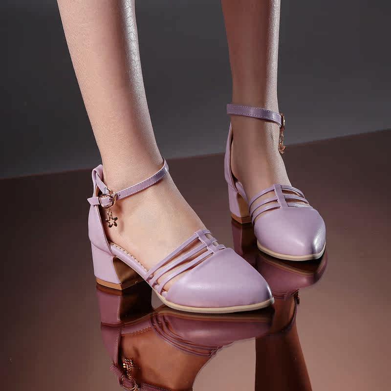 罗马凉鞋女夏季包头中空粗跟中跟一字带搭扣大童初中生学生鞋女鞋