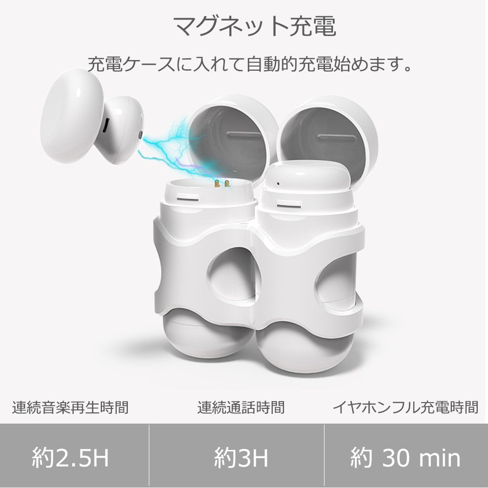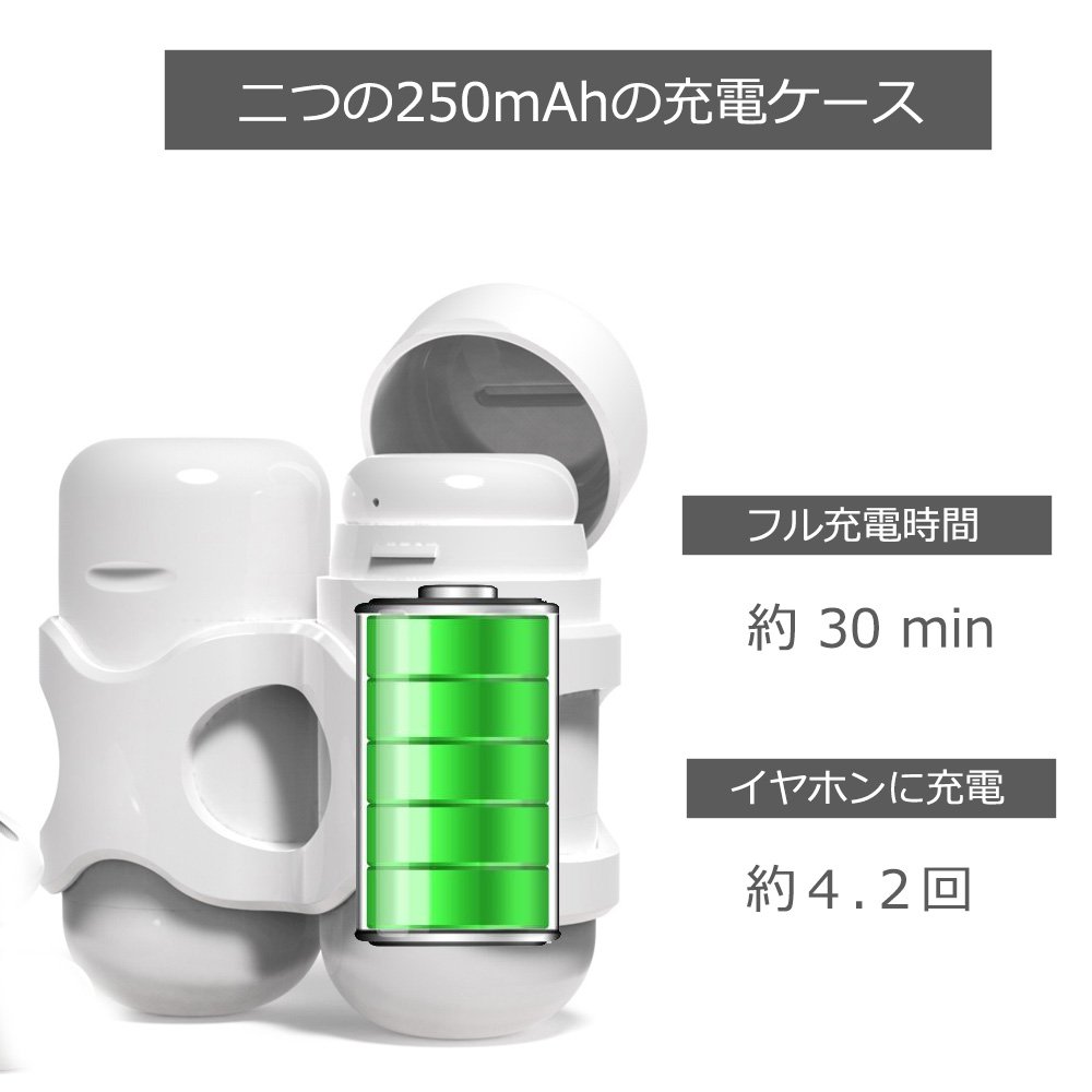 二つの250mAh酸素ボンベ のように個性がある充電ケース、イヤホンの収納が楽になります。満充電の充電ケースはイヤホンに約4.2回充電できます。【ワンボタン設計】 ワンボタン設計のために、片手操作、ハンズフリー通話 (音楽再生/一時停止、通話開始/終了/拒否/リダイヤル)などすべての操作は実現可能です。