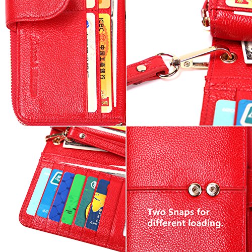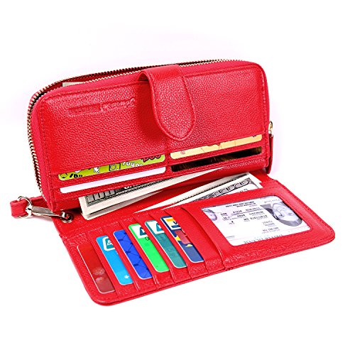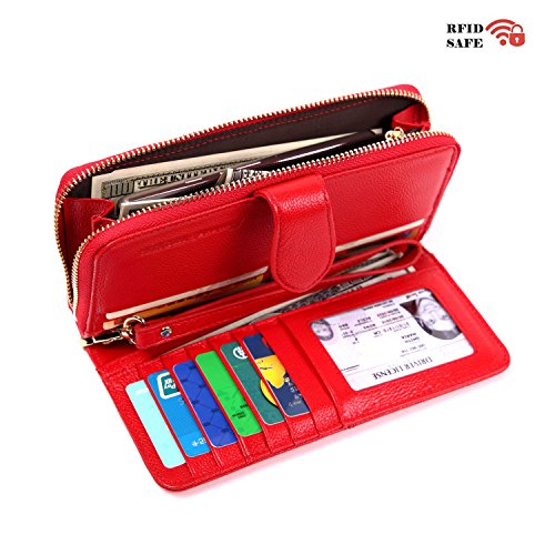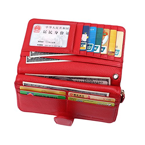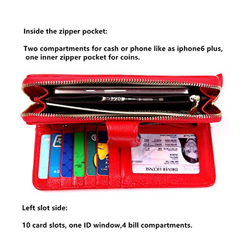 - ★ PRACTICAL- This wallet is equipped with 10 card slots, 2 currency pockets, 4 bill slots,one internal zipper pocket for coins and jewelry, one ID window with central cut out over, easy to access the ID card, all these areas are under RFID protection, this wallet is suitable for cash, coins, cell phone like as iphone7 plus, passport, pen, checkbook...removable wrist strap.