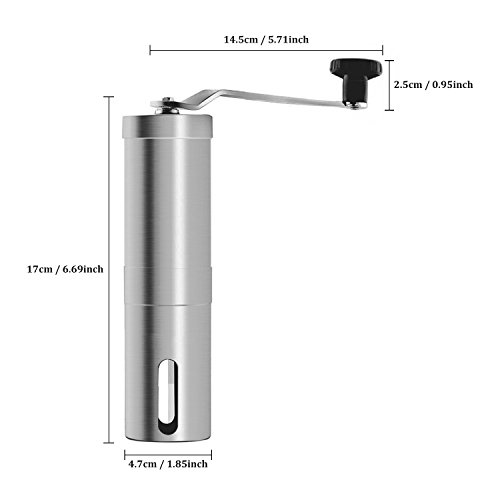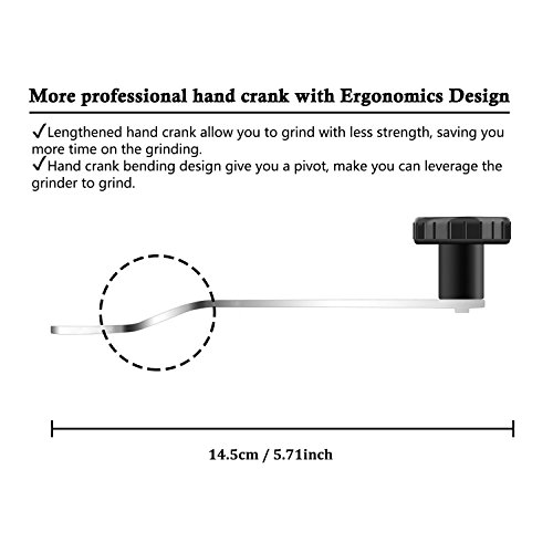 Our manual coffee grinder make of food grade material, stainless steel main body and ceramic burr. The lengthened hand crank accord with