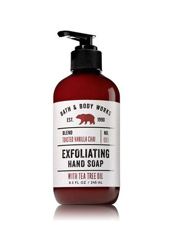 -. Feature : Exfoliating hand soap Toasted Vanilla Chai 8.3 Oz / A cozy-as-can-be blend of Whipped Vanilla, Spun Sugar, & Winter Spice. / This hand soap is specially formulated with pumice, keeping hands feeling silky, smooth and clean in just one step. / Wash away dirt and germs, while soothing Aloe and nourishing Vitamin E leave hands feeling soft. / Hand Soap with Tea Tree Oil.