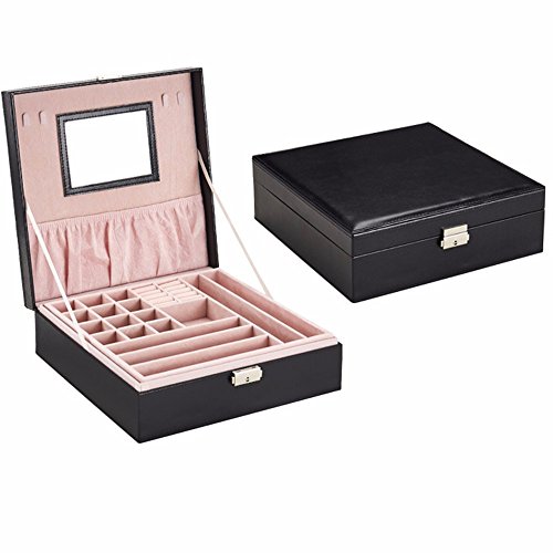 Soaptree 2 Layer Large Jewelry Box Earring Ring Necklace Bracelet Watch Display Storage Case with Mirror(A-Black)