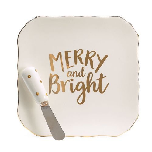 - Cream square shaped plate with gold trim and "Merry and Bright" in gold