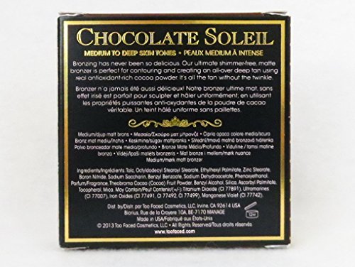 Studio : USA Publisher : USA Binding : Health and Beauty Product Description Too Faced Chocolate Soleil Matte Bronzing Powder makes getting glam-and-tan downright delicious. Too Faced combines the natural, therapeutic effects of real cocoa powder with their signature bronzing pigments, creating a unique matte bronzer that neutralizes red and evens out and enhances all skintones. The complexion is left with a flawless finish, a gorgeous radiance, and a subtly sweet scent.