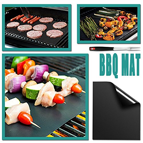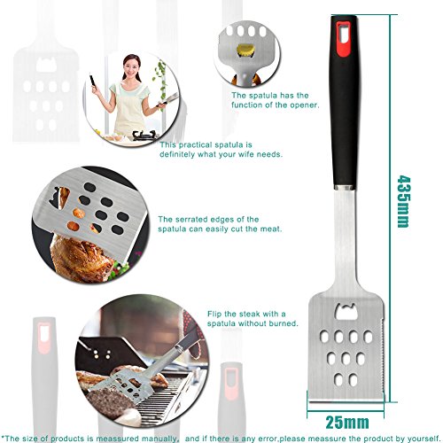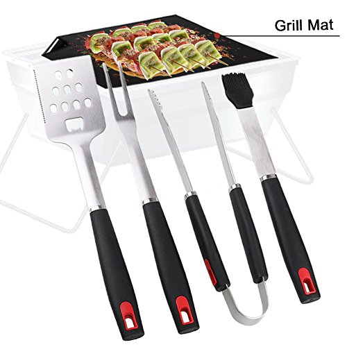 - PROFESSIONAL BBQ SET – Top-quality BBQ accessories include easy-to-grip tongs, meat fork, silicone basting brush, non-stick BBQ mat, and a 3-in-1 spatula that incorporates a bottle opener and serrated edge to cut proteins