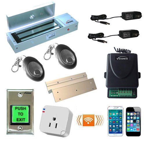 -. Feature : (1) VIS-ML1200LED: 1200lb Indoor Electric Lock with LED Sensor and (1) VIS-ZL1200: l and z bracket for 1200lb electromagnetic lock / (1) VIS-8004: 1-Channel Receiver 315mhz 11-24 VAC/DC / (2) VIS-8005: Fixed Code Transmitter, Pre-coded Wireless Remote / (1) VIS-8003: WIFI Smart Plug Outlet US Standard, (2) VISCP100: 12v 1000ma Power supply / (1) VIS-7000: Illuminated green 2" square. SPDT switch, 10A@125~250VAC. Stainless-steel single-gang plate. SMARTPHONE NOT INCLUDED
