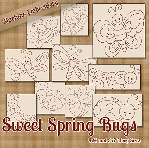 Sweet Spring Bugs Redwork Embroidery Machine Designs on CD for Machine Embroidery - 10 Beautiful Patterns - 2 Sizes Each - PES JEF EXP XXX VIP HUS DST