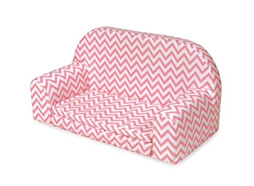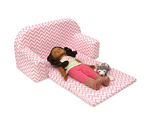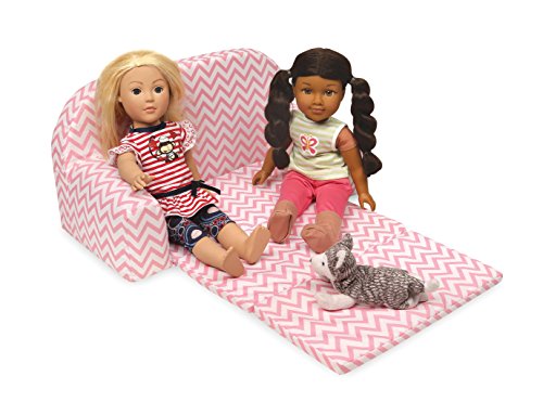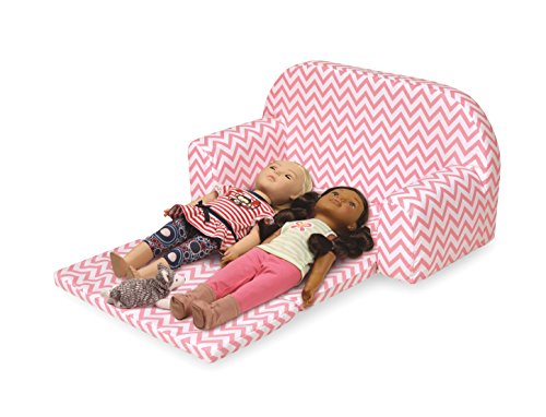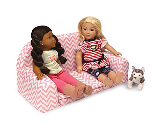 -. Binding : Toy -. Brand : Badger Basket -. Color : Pink/White -. EAN : 0046605166628 -. Feature : Doll couch folds out into a bed / Fully assembled and the cushions are permanently attached so they won't get lost / Super cool chevron patterned fabric / For all dolls up to 20 inches / Overall assembled dimensions (chair): 20 inches W x 10 inches D x 10 inches H (24 inches D as a bed) -. Label : Badger Basket - DROPSHIP -. Manufacturer : Badger Basket - DROPSHIP -. Model : 16662 -. MPN : 16662 -. PackageQuantity : 1 -. PartNumber : 16662 -. ProductGroup : Toy -. ProductTypeName : TOYS_AND_GAMES -. Publisher : Badger Basket - DROPSHIP -. Studio : Badger Basket - DROPSHIP -. Title : Badger Basket Chevron Upholstered Doll Sofa with Foldout Bed Fits American Girl Dolls, Pink/White -. UPC : 046605166628 -. Warranty : 30 day warranty against manufacturer defects