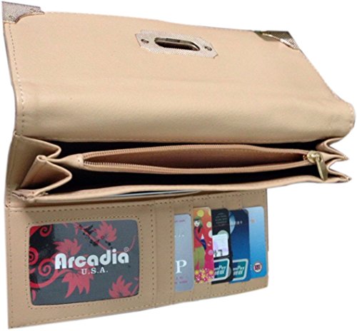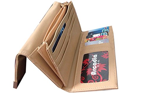 Arcadia Fashion Bi fold Wallet Features 100% leather like Material (PU Leather) And Metal Accessories. Turn Lock Access to bi fold Area with multiple Card Slots And A Clear I.D Slot. An Additional Zipper Pocket For More Space. Length 7.5 Height 4 Width 1.5 inches.
