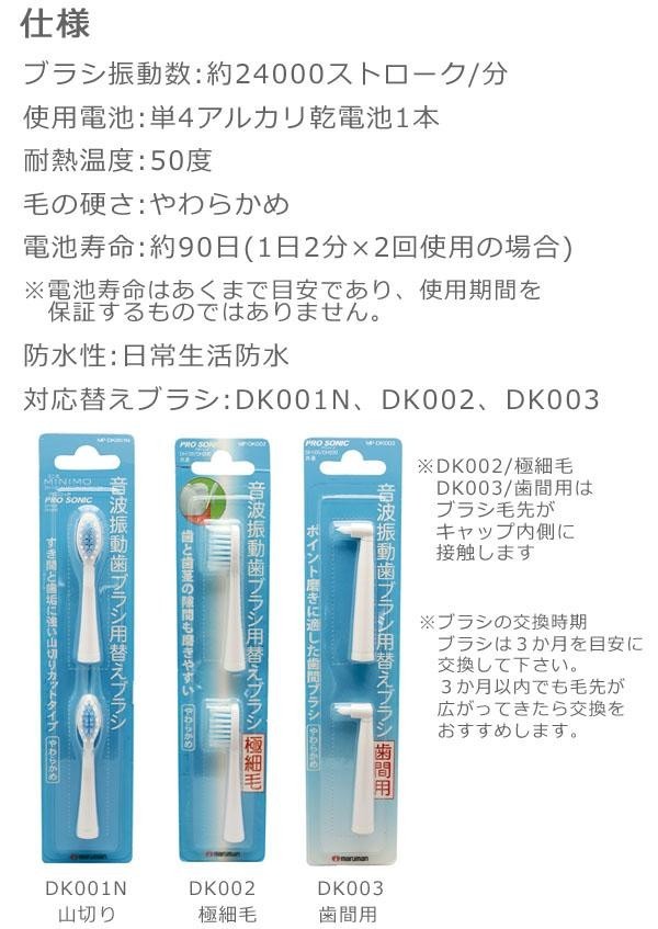 | 仕様 | ブラシ振動数:約24000ストローク/分 使用電池:単4アルカリ乾電池1本(付属) 耐熱温度:50度 毛の硬さ:やわらかめ 電池寿命:約90日(1日2分×2回/日使用) 防水性:日常生活防水 対応替えブラシ:DK001N、DK002、DK003 |