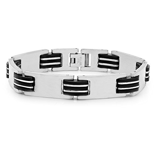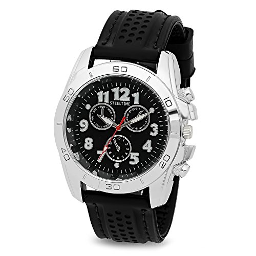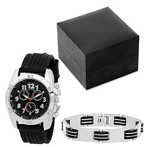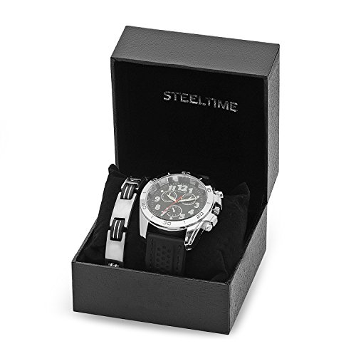 Stainless steel crafted watch with black rubber strap and imitation chronograph. Comes with matching stainless steel and black rubber bracelet.