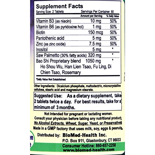 -. Feature : Vendor: Biomed Health / Item: Biomed Health Advanced Bao Shi Men's Hair Supplement - 120 Tablets / For: Hair, Skin, and Nails / Item UPC No: 752337600117 / Gluten Free - Dairy Free - Yeast Free - Wheat Free - Vegan
