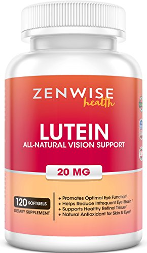 -. Feature : What is Lutein? - Zenwise Health Lutein is an all-natural eye supplement that offers a wide range of supportive treatment for human eyes. This supplement contains 20mg of Lutein, a powerful carotenoid vitamin (commonly found in food sources) that has been shown to help support healthy retinal tissue, as well as vision and fatigue-free comfort. / How to Have Healthy Skin & Eyes - These 20 mg natural eye care health supplements are an antioxidant that not only aids in eye function, but also helps with keeping skin firm, hydrated and protected from free-radical damage. / Positive Effects for the Macular Health - This eye-protecting Lutein formula offers a wealth of benefits for the eyes. Use of this supplement has been shown to help men and women of all ages keep eye cells healthy and functioning properly, while also aiding in keeping vision clear and healthy to keep degeneration at bay. / Helps Relieve Eye Fatigue - If you find yourself staring at a computer screen for long stretches of time, or if you've simply had a long day, Zenwise Health's advanced Lutein vitamins are a natural solution to help relieve eye strain. / A Supplement You Can Trust - Zenwise Health proudly formulates its all-natural 120 count Lutein supplement in an FDA-registered facility that is both NSF and GMP certified, and all products are manufactured in the USA.