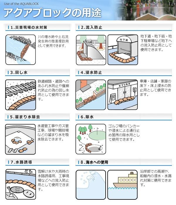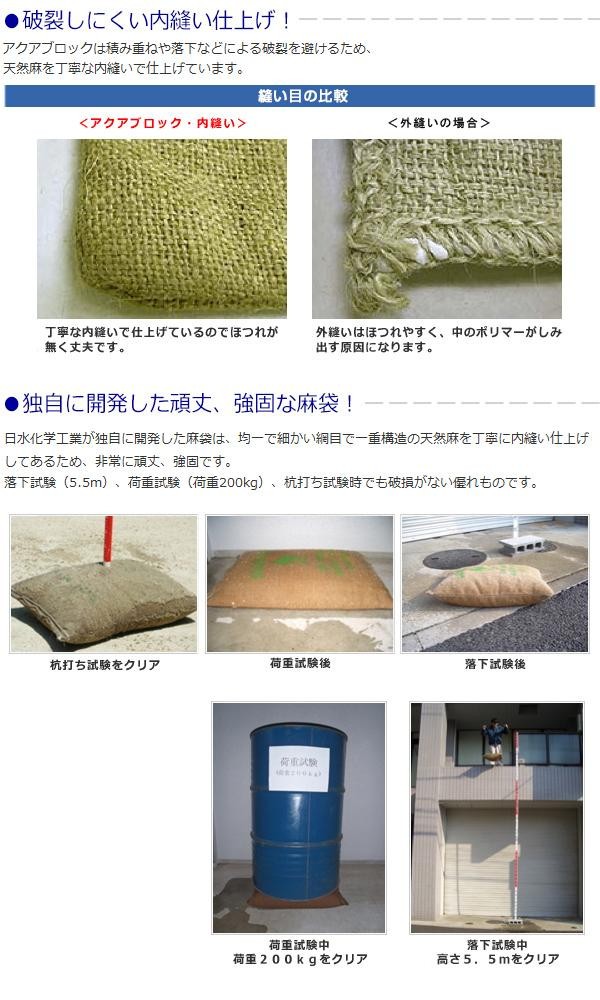 | 海水対応の高吸水性ポリマーを使用することで、これまで不可能とされていた海水での使用を可能にしました。また、海水だけでなく、河口付近の真水と海水の混ざった水や、河川等のまったく海水を含まない水でも使用可能です。保管に場所もとりません。 |