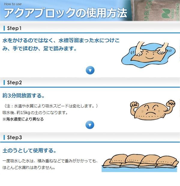 海水対応の高吸水性ポリマーを使用することで、これまで不可能とされていた海水での使用を可能にしました。また、海水だけでなく、河口付近の真水と海水の混ざった水や、河川等のまったく海水を含まない水でも使用可能です。保管に場所もとりません。 |