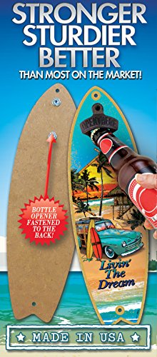 (SJT27001) Living the Dream Surfboard Bottle Opener featuring art from Michael Messina, 5" x 16" Bottle Opener Surfboard Plaque