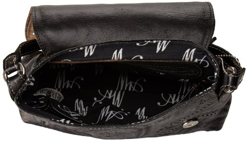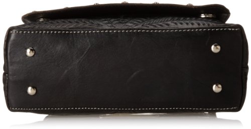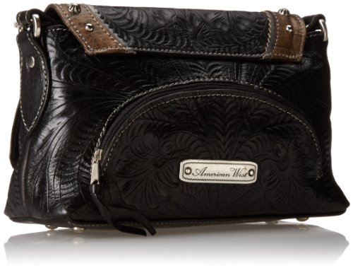 Crossbody flap bag with magnetic closure under flap. Handbag also features an adjustable shoulder strap and a back zipper cell phone pocket. Inside has a zipper compartment and two pouches. Hand tooled vegetable tanned black leather is trimmed with distressed charcoal brown leather and features silver leather trim. Accented with large antiqued silver spots, smooth silver spots, and a silver cross conchos. Hand tooled front and back. Each handbag features a silver signature keepsake and includes a protective storage bag. Each piece is made by hand, one at a time. Shoulder Strap 24-27" drop, 50-55" length This item is backed by the American West Lifetime GuaranteeFeature