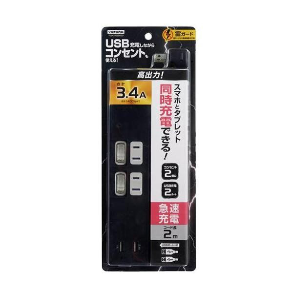 | 仕様 | コンセント口数:2口(合計1400Wまで) USBポート:2ポート(最大出力2.4A・合計3.4Aまで) 最大サージ電圧:6000V 個別スイッチ付き プラグ形状:L型 コード長:2m |