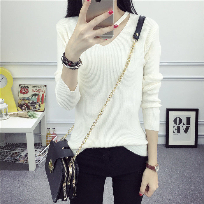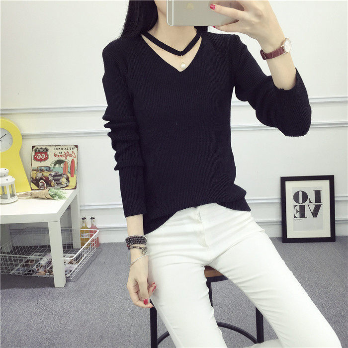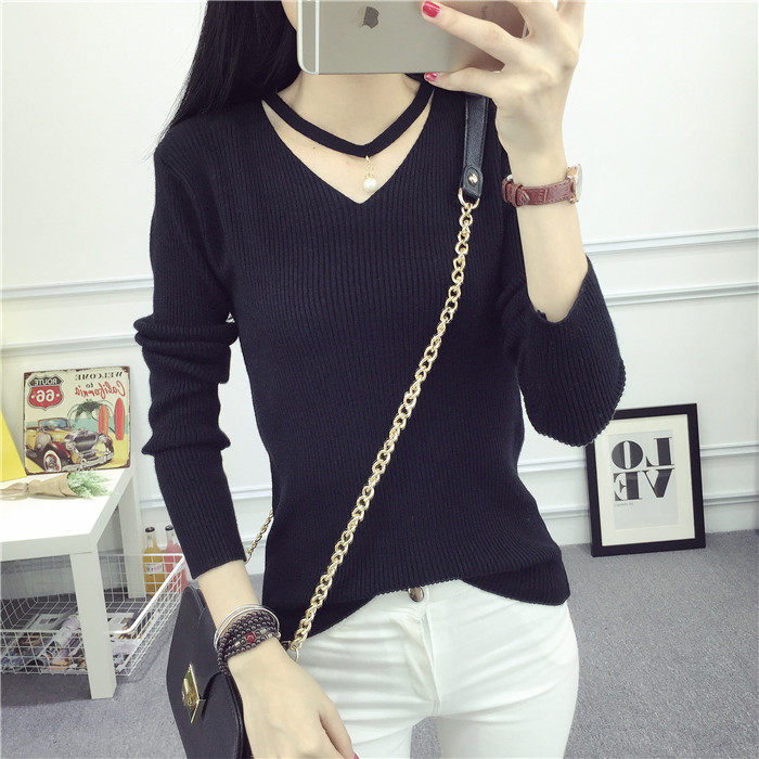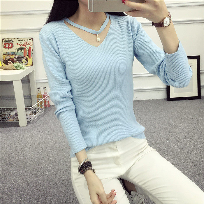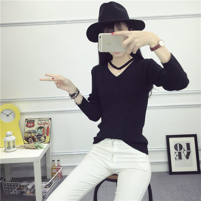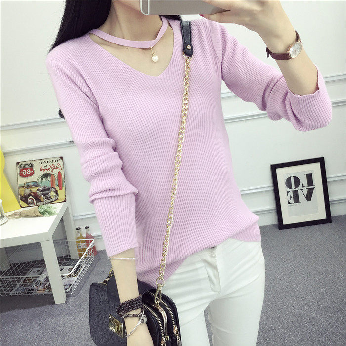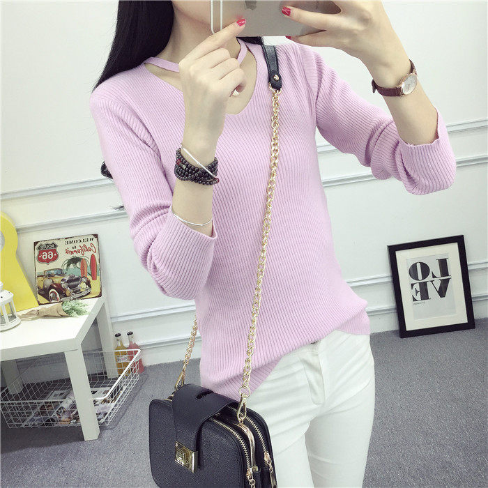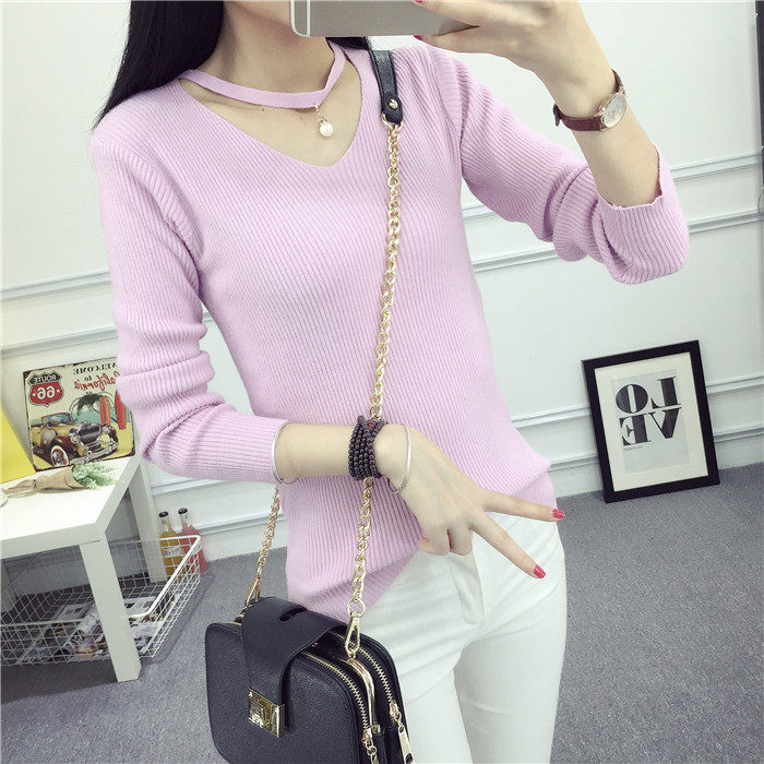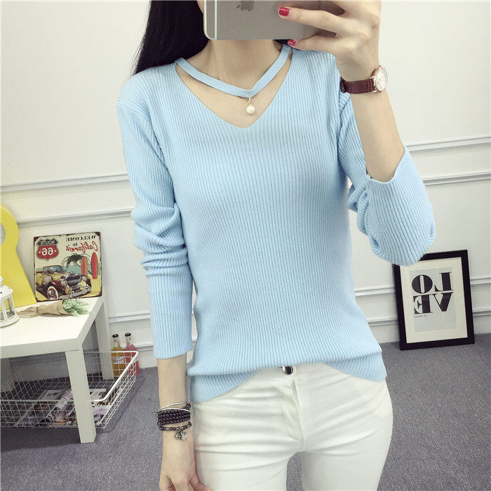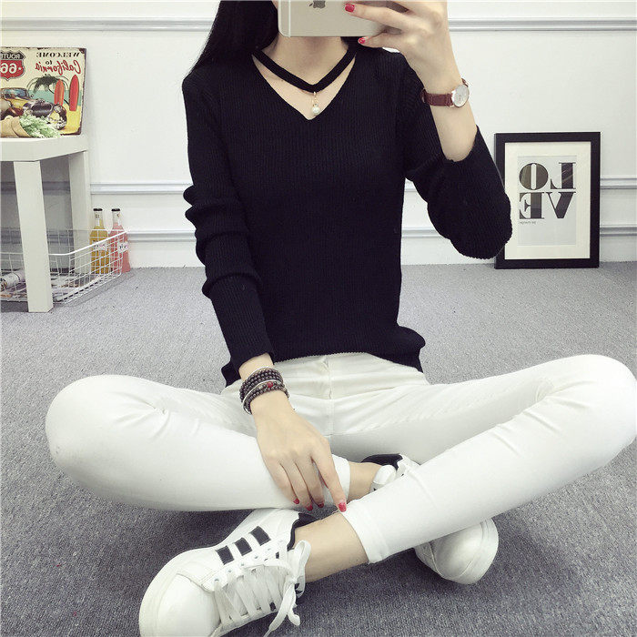 秋新款韩版镂空纯色女针织衫韩范学生体恤修身百搭长袖毛衣打底衫