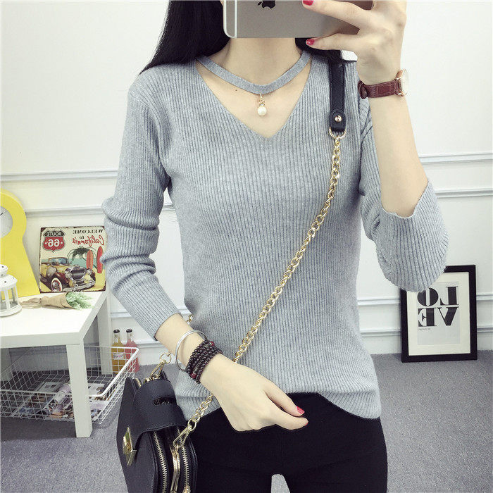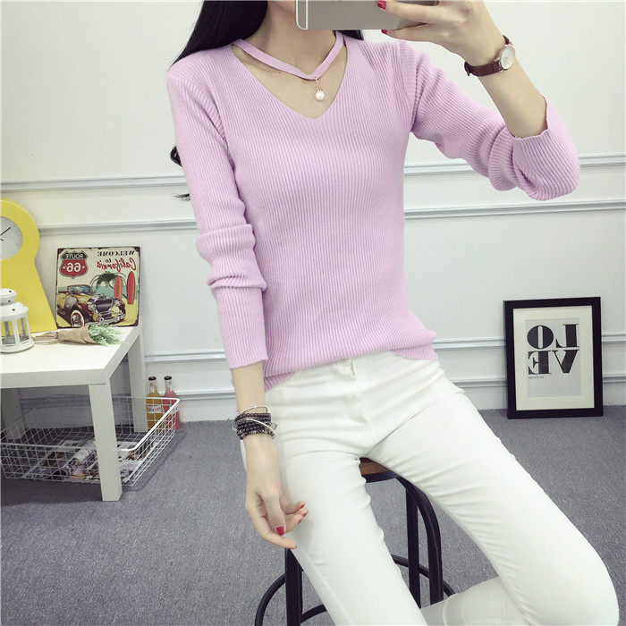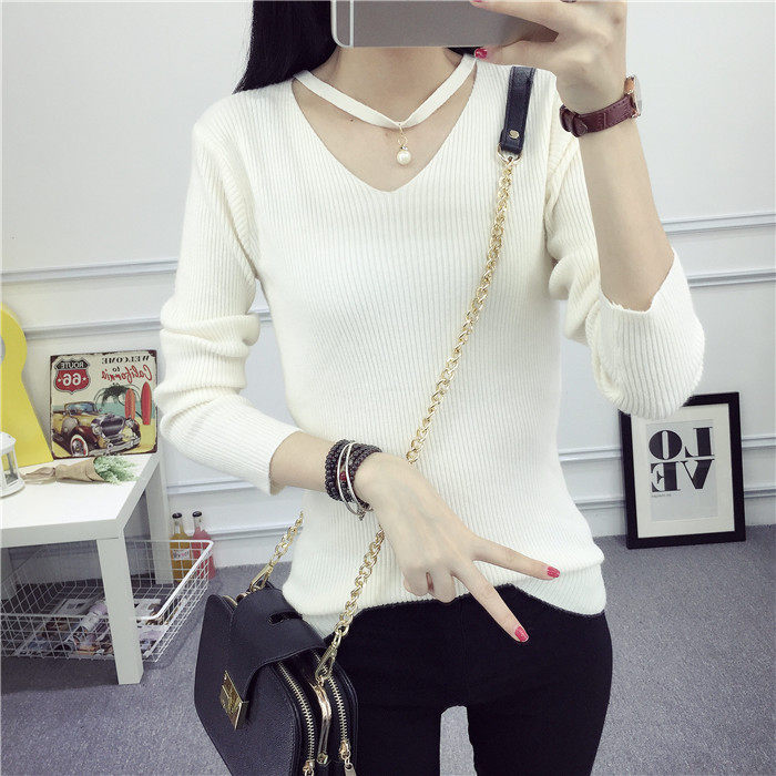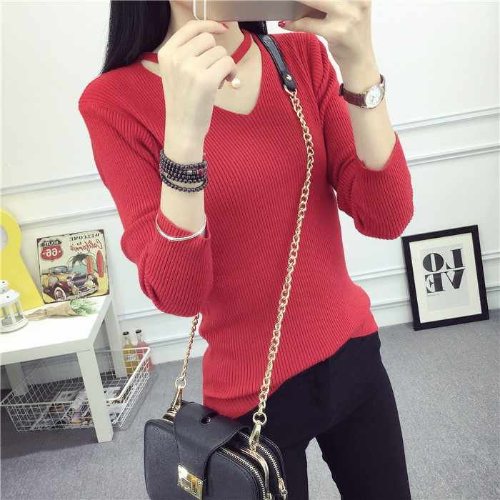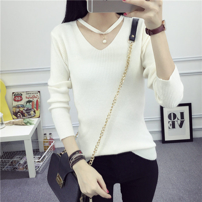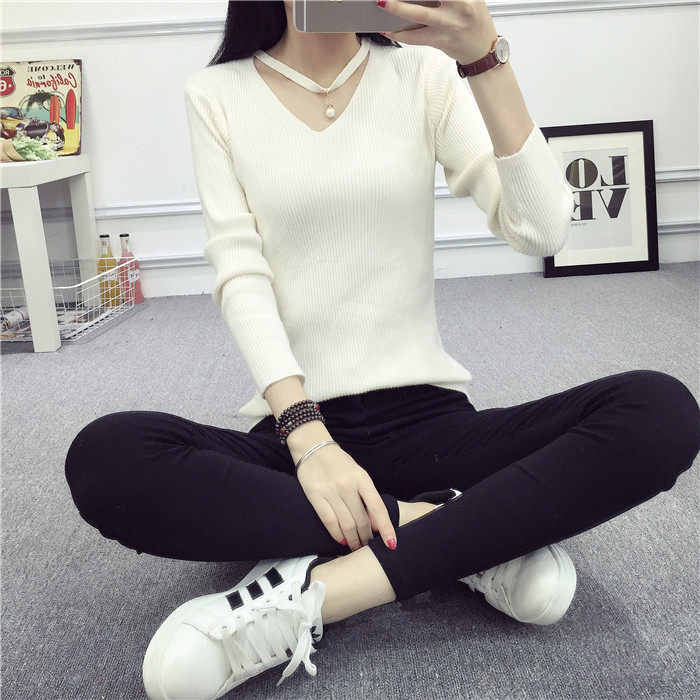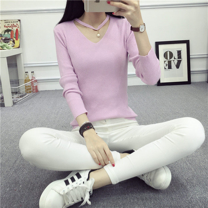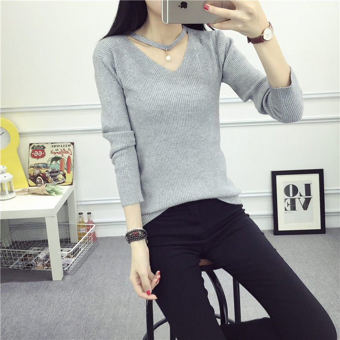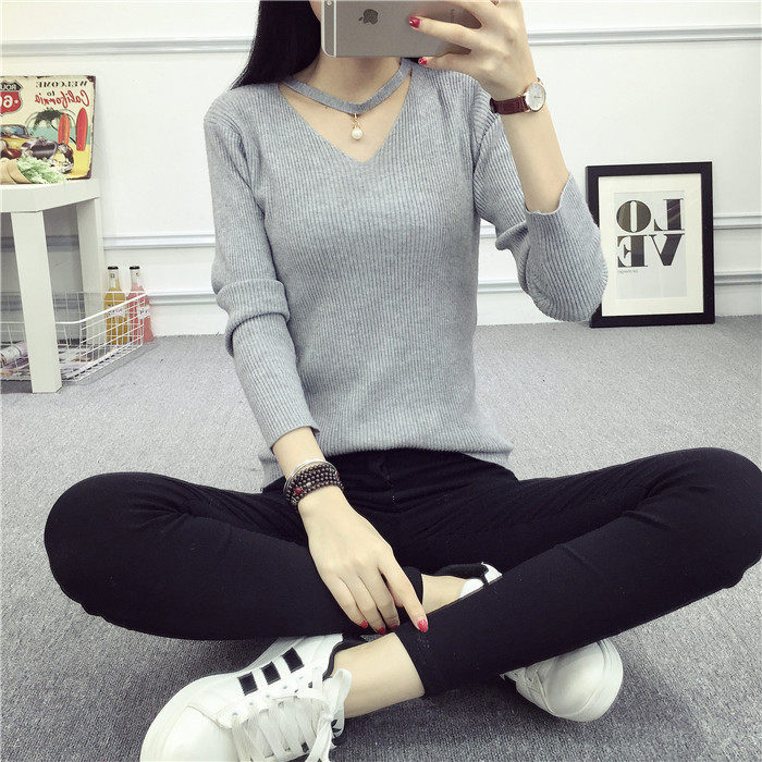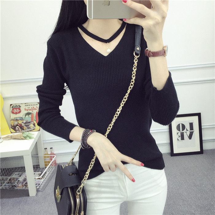 秋新款韩版镂空纯色女针织衫韩范学生体恤修身百搭长袖毛衣打底衫