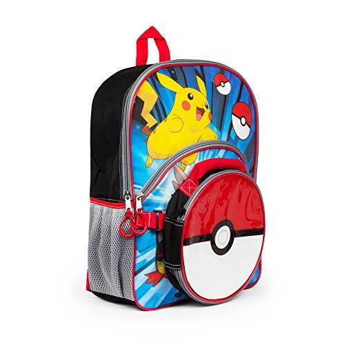 Product Description Pokemon "Lunchin" Backpack with lunch kit. Main compartment is ideal for organizing books, binders, folders and other supplies. Multi character with side air mesh pockets on the backpack. Lunch kit is round with reverse print clear PVC with flat handle and piping around edges. 0