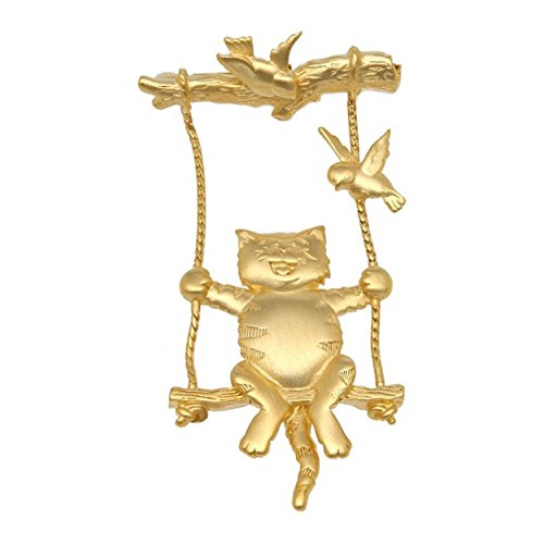 Beautiful sculpted happy cat motif pin featuring a unique golden cat having the time of his life swinging on a moving swing with lovely onlooking birds. A cheerful scene.