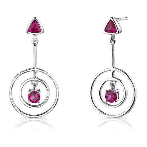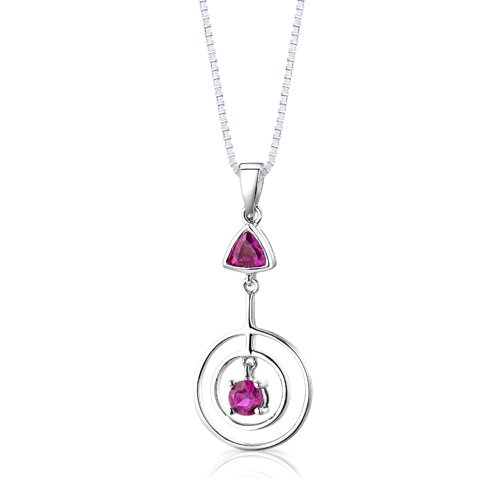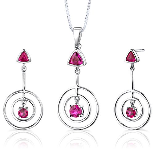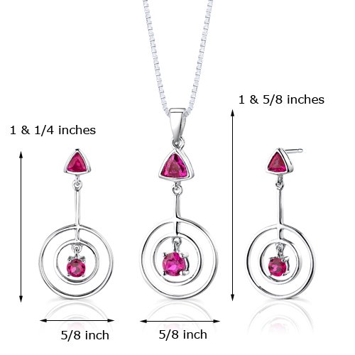 Earrings = Lab Created Ruby 2 pieces, Trillion cut, 4.00mm, Lab Created Ruby, 2 pieces, Round shape, 4.00mm. Earring Dimensions: 1 1/4 x 5/8 inches. Pendant = Lab Created Ruby, 1 piece, Trillion cut, 5.00mm. Lab Created Ruby, 1 piece, Round shape, 5.00mm. Pendant Dimensions: 1 5/8 x 5/8 inches. Earrings and Pendant have a total weight of 7.20 grams and are set in pure Sterling Silver Rhodium Nickel Finish with .925 stamp. Gemstones have a vibrant rich color and eye clean clarity. The Pendant and Earrings feature top quality workmanship and a beautiful finish. Includes Free 18 inch Sterling Silver Rhodium Nickel Finish Box Style Chain, Free Ribbon Gift Box.Feature