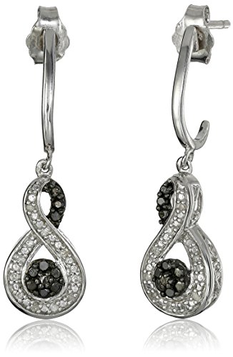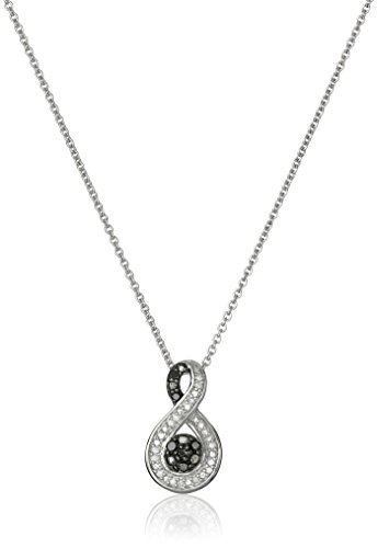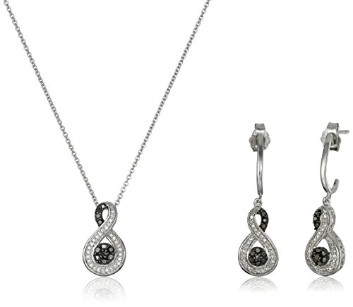 Two-piece sterling silver infinity symbol pendant necklace and drop earrings set each featuring pave-set black and white diamonds