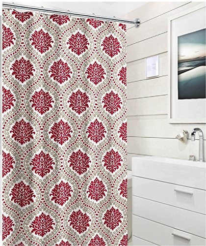 Elegant Embossed Fabric Shower Curtain: Festive Red Taupe White Floral Geometric Damask Design