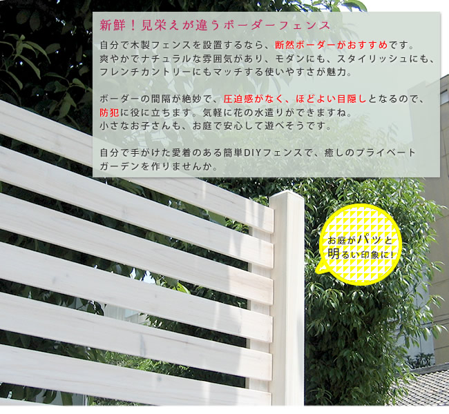 ●新鮮!見栄えが違うボーダーフェンス自分で木製フェンスを設置するなら、断然ボーダーがおすすめです