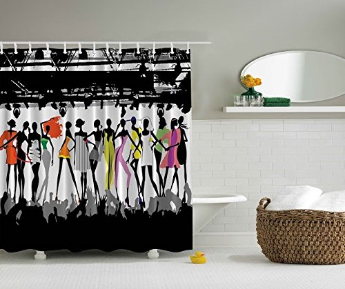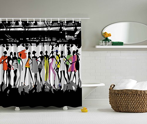 Funny Shower Curtain Feminine Decor by Ambesonne, Modern Colorful Fashion Show Bodycon Runway Stage Lights Concert Chic Top Models Fantasy Theme Bathroom Fabric Curtain, Black White Coral Purple Green