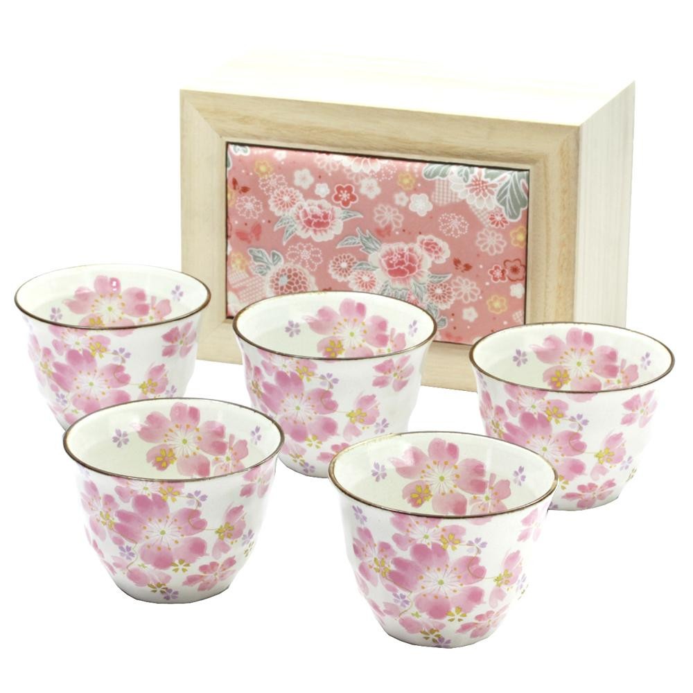 淡い色で上品に仕上げた桜柄の煎茶碗5客セットです。大切な方へのギフトにも最適です。