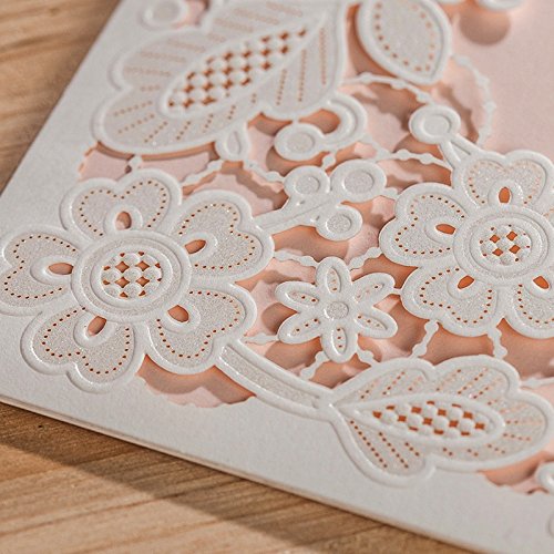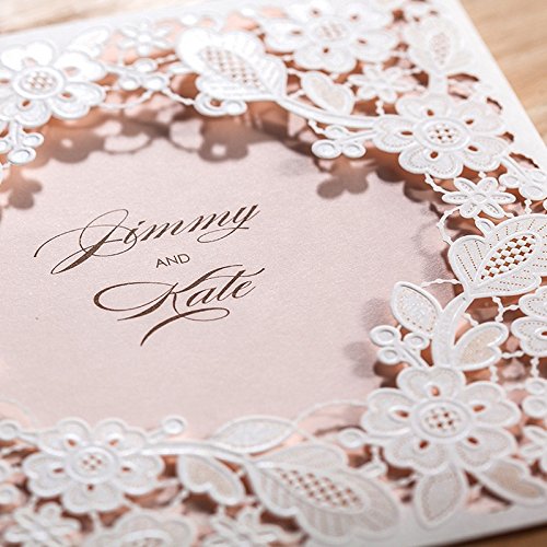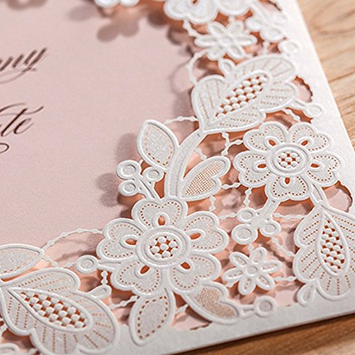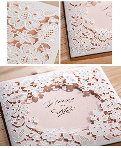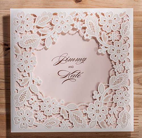 Doris Home Square White Laser-cut Lace Flower Pattern with Pink inner Wedding Invitations Cards (50)