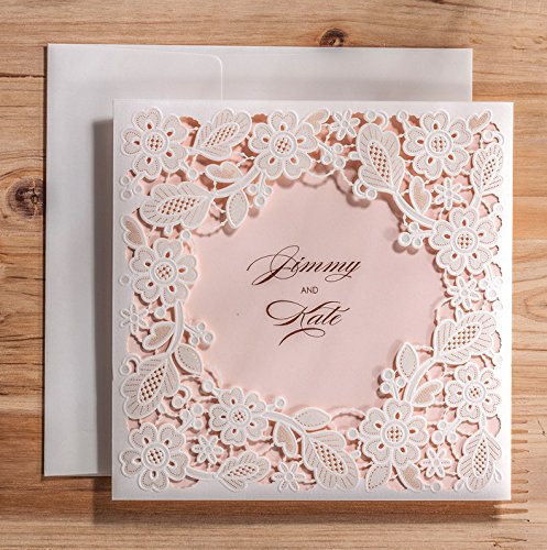 6.3 x 6.3 inch White laser cut wedding invitation with free ivory envelopes. You can print the invitation with your own design by home printer if you are good at DIY.