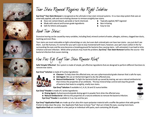 -. Feature : Deluxe kit contains: 4 oz (118 ml) solution, 1/2 oz (14 g) white powder, jar of 30 rayon applicator pads, package of refill applicator pads and detailed instructions / NR formula - no refrigeration required / Treats tear stains, urine stains, food stains, licking stains, red yeast infections, and bacterial infections / Works great for dogs, cats, and puppies/kittens over 8 weeks old / Proudly made in the USA