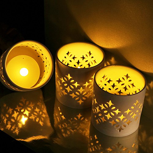 - SET OF 3 CALLA LILY PATTERNED CANDLE HOLDERS WITH TEA LIGHTS BRING YOUR HOME A SERENE AMBIENCE - Each white ceramic pillar holder (3" Tall) designed with hollowed-out CALLA LILY patterns & a 3" Wide round opening on top, ideal for your home decor by day - Each comes with a LED tea light, giving off a flickering glow through Calla Lily cutouts at night, casting amber Calla Lily shadows on wall/table for added appeal - Light up for 6 hours automatically at the same time every day when switched on.