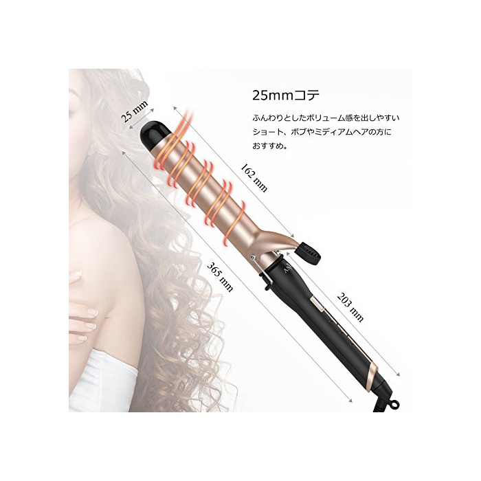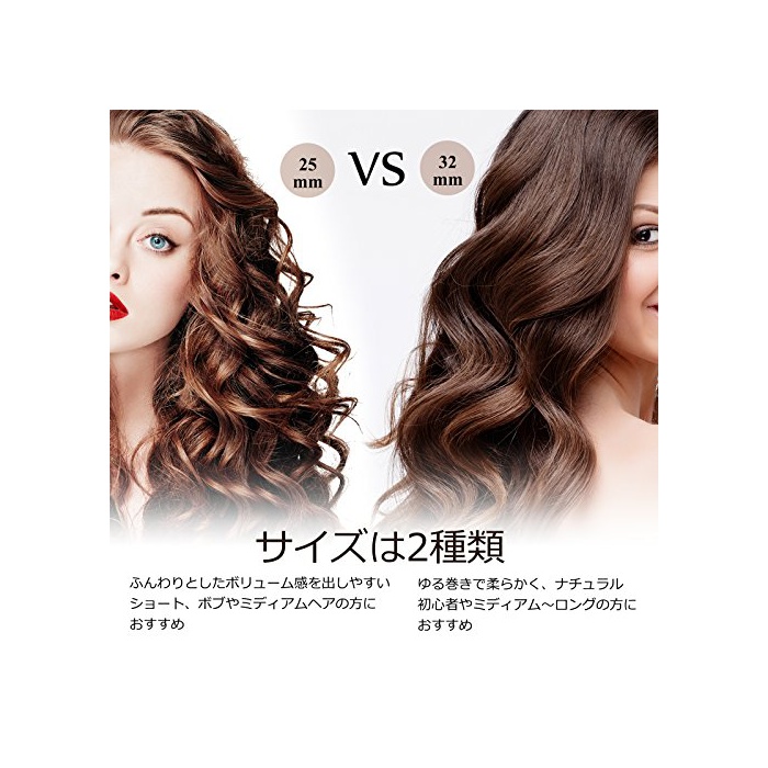 살짝 한 볼륨감을 내밀기 쉬운 25mm:쇼트,밥이나 미디엄 헤어 에게 추천에,내감음 헤어나 모처(먼저)만 감는 듯한 두둥실 헤어 어레인지,강한 웨이브를 내밀기 싶을 때에 대활약.## 후와(불화)에 감는 경우,32mm사이즈를 권장합니다.