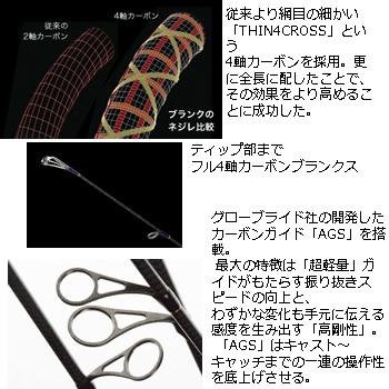 Foojin’ NEXT STAGE 새로운 시대에의 문 ●가는 몸으로 토크 풀,그 위에 또 샤프이다“풀4축 카본 blank《스》”로,글로브 라이드사가 개발한 카본 가이드「AGS」를 탑재.●종래 보다 그물코(그물망)의 세세한「THIN4CROSS」이라고 하는4축 카본을 채용.더욱 더 전장에 배한 것을에,그 효과를 보다 높이는 것(일)에 성공했다.채찍과 같이 하여지지만,나사《레》를 억제하는 4축의 효과로 보다 샤프인 액션이 가능하게 되었다.가는 몸 두께 blank《스》에 4축 카본을 배합하는 것에,나사《레》가 큰폭으로 경감되고, 결과,「아큐라 C」의 향상과「비거리」업으로 이어진다.한층 더 본래 blank《스》에 전해진다「파워」가,나사《레》# 방향으로 빠져나가 가 파워 로스가 되면 무렵,그것을 억제하는 것,보다 본래의 blank《스》의 파워가 남김없이 발휘할 수 있게 된다●글로브 라이드사의 개발한 카본 가이드「AGS」를 탑재.최대의 특징은「초경량」가이드가 가져오는 흔들어 빼기 스피드의 향상과,몇 안 되는 변화도 수중에 전하는 감도를 만들어 낸다「고강성」. 「AGS」서는 캐스트~캐치까지의 일련의 조작성을 향상(인상) 시킨다.