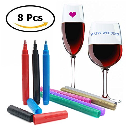 -. Feature : SET OF 8 WINE MARKERS - Just mark your glass however you want with these amazing, no smear, markers. Perfect for weddings and all kinds of parties and events. Never lose your drink again in a party. / WASHABLE PENS GREAT ALTERNATIVE TO CHARMS - Fast dry, no smear, non-toxic food safe ink pens, doesn't get in the way like annoying wine charms. / GREAT FOR DIFFERENT USES - Since these funny wine marker pens can write on any glass surface they are great for drawing on windows, marking glass jars, plates and wine bottles. Use them on any glass or ceramic surface you want to leave a message on. / EASY TO USE, AFFORDABLE AND MESS- FREE - Customize your drinking glass with unique designs to keep track of your favourite wine, beer or other beverage. Easy erasable with soap and water, dishwater safe. / UNIQUE GIFTING IDEA FOR FRIENDS, FAMILIES AND WINE CONNOISSEURS - Give them as a gift for the hostess at the next party you're attending.