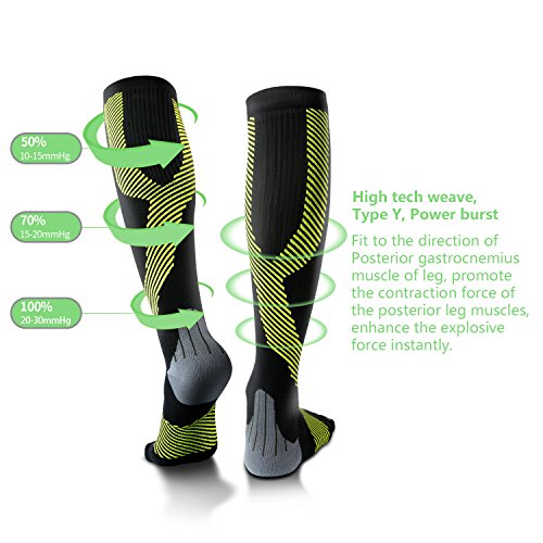 TECHNOLOGY: Graduated Compression provides the most compression in the ankle area and less in the calf area, promote blood circulation and oxygen flow, these not only prevent cramping, fatigue, swelling, but also help muscle recovery, spider, varicose veins and diabetic