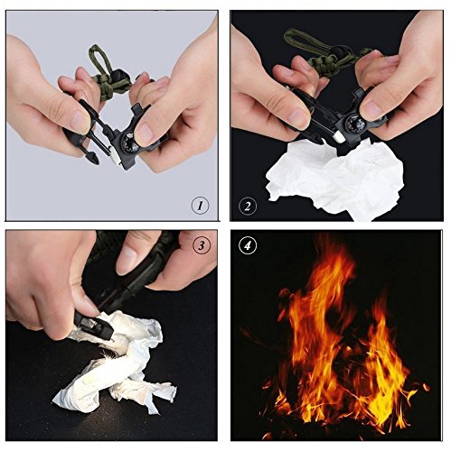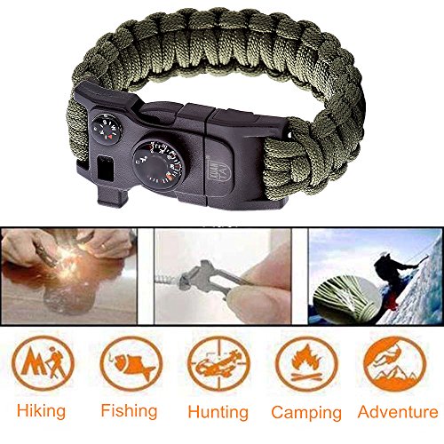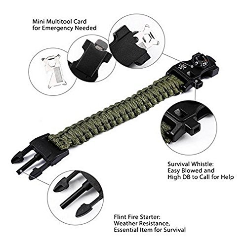 - 【12 In 1 Emergency Survival Kit】: Bracelet Comes With 12 Emergency Kit Which are Parachute Rope,Compass,Thermometer,Knife,Whistle,Screwdriver,Wrench,Fire Scrapper,Fire Starter,Bottle Opener,Saw Tooth and Nail File.Best Outdoor Survival Gear for Camping and Hiking.