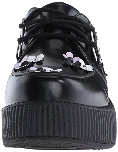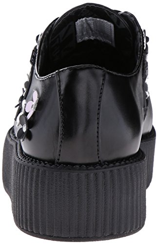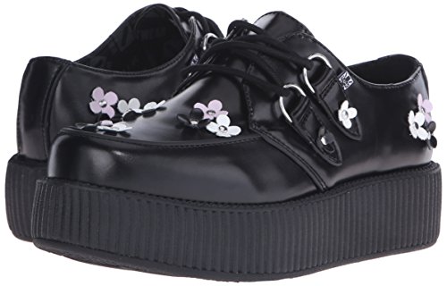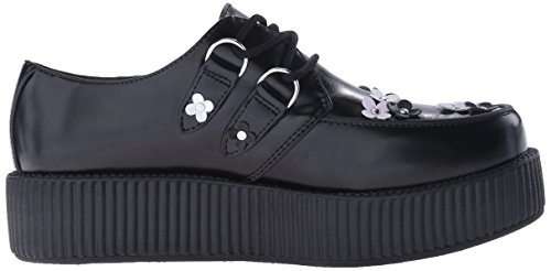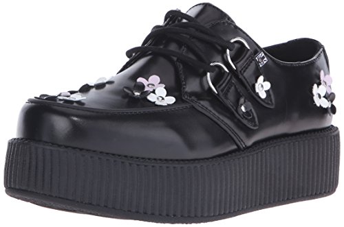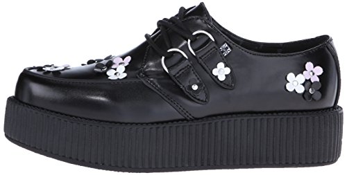 Product DescriptionOur classic creeper with a twist! Black leather with black, pink and white daisy appliques riveted onto upper and silver metal d-rings on our new and improved 2 inch0
