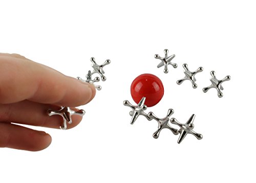 Studio : Home-X Publisher : Home-X Binding : Toy Product Description The game of jacks is a nostalgic favorite among children and adults alike. It has remained a popular favorite game throughout the years, that involves tossing small objects to be picked up in succession. HELPS WITH DEVELOPMENT: The game of jacks is a good tool for building eye-hand coordination for young children. It has been promoted as a helpful tool with children with autism and sensory processing disorders to build their motor skills as well as their social skills. Because the game of jacks can be played alone or with others and requires little in the way of equipment, it has remained a popular activity for children through the years. HOW TO PLAY: The basic game involves gathering all the jacks in one hand and gently tossing and scattering them on a flat surface. Then the ball is tossed in the air with the object of the game to pick up the designated number of jacks with the same hand and catching the ball on the first bounce in that same hand. Play starts with picking up one jack at a time until all the jacks have been picked up (onesies). The play continues with more sets, picking up two jacks at a time (twosies). Then three, etc, until you progress to pick them all up on with one bounce of the ball. Set includes 10 metal jacks and 1 rubber bounce ball, and comes in a white box. Jacks are crafted from smooth and shiny zinc alloy. Small parts, not recommend for children under age 4. 0