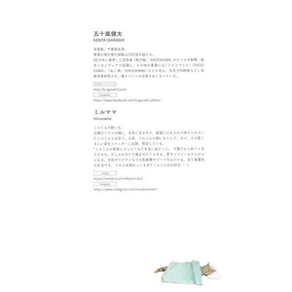 【商品説明】 定価(税込み):1,080円 値引き:10% OFF ツイッターを開始してわずか6か月でたちまち11万人超のフォロワーがついた保護猫のミルくん。見た目は愛くるしいブランド猫ですが、捨て猫でした。そんなミルくんを、「飛び猫」、「フクとマリモ」の人気猫写真家、五十嵐健太さんが撮りおろした写真集です。ミルと出会った場所は家の近くの公園です。公園のトイレの横に毛布に包まれて紙袋に入れられて捨てられていました。 バーゲンブック 新品 特価 格安 ホーム ライフ ペット 人気 写真 写真集 写真家 | |
