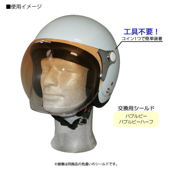 コイン1つで簡単装着できるので、取り付け時に工具が不要です。 生産国:台湾 素材・材質:ポリカーボネイト 重量:約170g 仕様:オプション専用シールド ※サプライヤー直送品 ※2019年3月下旬入荷分予約受付中【商品名】ダムトラックス(DAMMTRAX) バブル ビー シールド LIGHT SMOKE